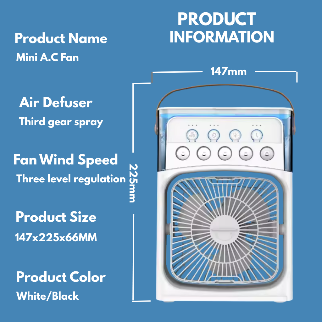 Mini A.C Fan is a portable cooling device designed to provide instant relief from the heat. It works by generating a powerful airflow to create a refreshing breeze, keeping you cool and comfortable wherever you go.